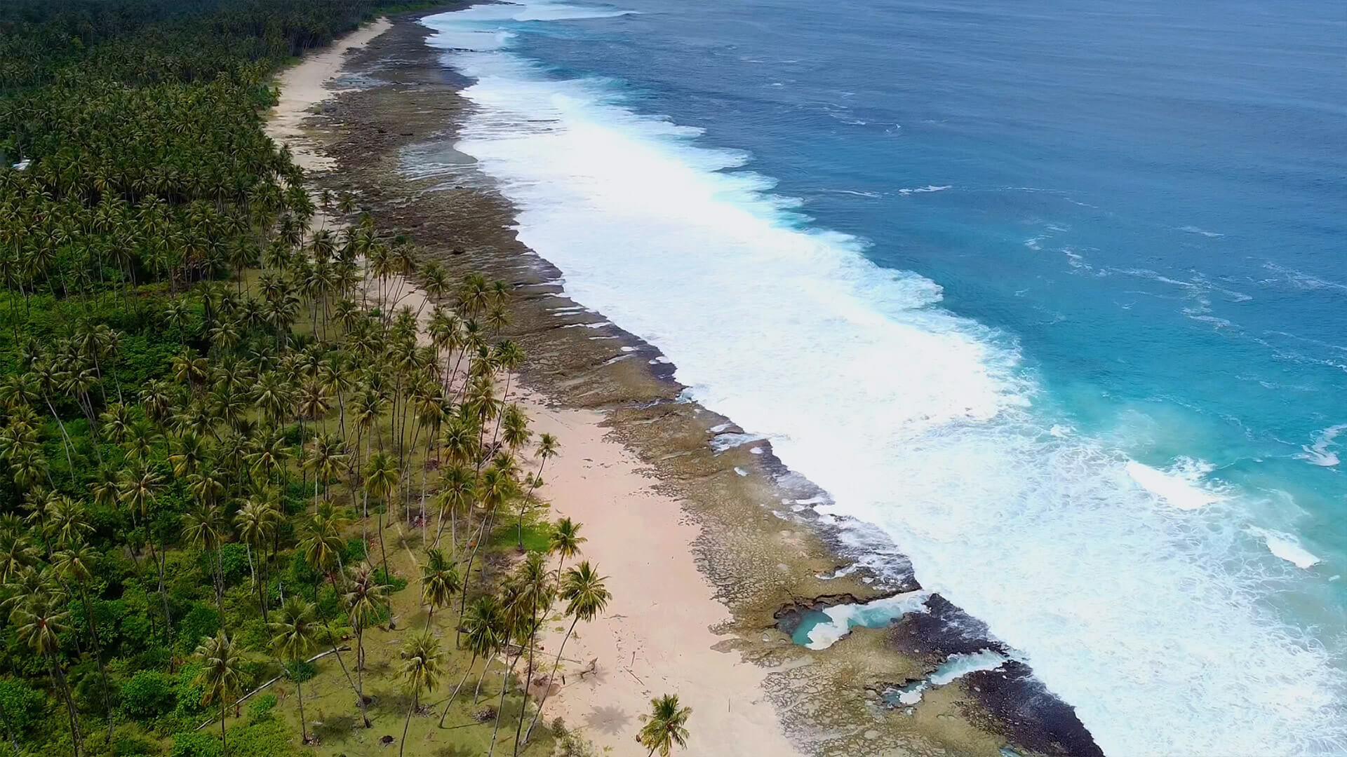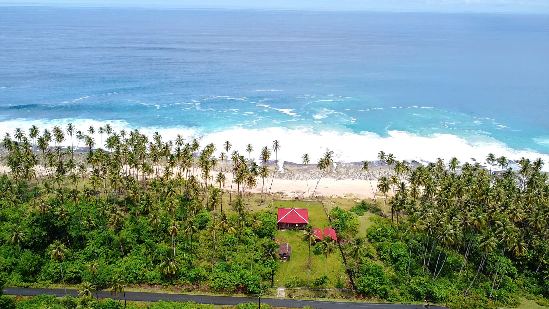 Beautiful south-west facing beachfront lots with tall coconut palms near Kita Surf Resort and the airport. Ocean and sunset views. Located in the wave-rich south western region of Simeulue Island. The blocks are on both sides of Seaside Surf Lodges (to the left and the right of the red buildings pictured).